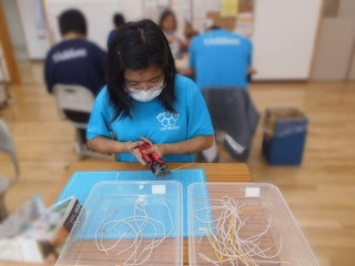 この日は、5つの工程に分かれて取り組んでいます。作業工程の中には、カッターやワイヤーストリッパーなどの道具を安全に使って作業を進めていました。